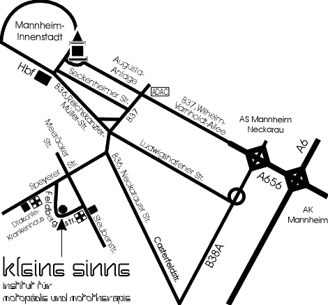 Am Autobahnkreuz Mannheim fahren Sie die A656 in Richtung Mannheim/Innenstadt. Folgen Sie der B37 Richtung Ludwigshafen. Biegen Sie nach etwa 800m links ab auf die B36 Richtung Neckarau (Schwetzinger Straße). Nach der Eisenbahnbrücke biegen Sie rechts ab und folgen der Speyerer Straße Richtung Diakoniekrankenhaus (etwa 900m), überqueren die Meeräckerstraße und biegen Sie danach die erste Straße links in die Feldbergstraße ein. Nach etwa 600m finden Sie auf der linken Seite unsere kostenlosen Parkplätze beim Einkaufszentrum Niederfeld.